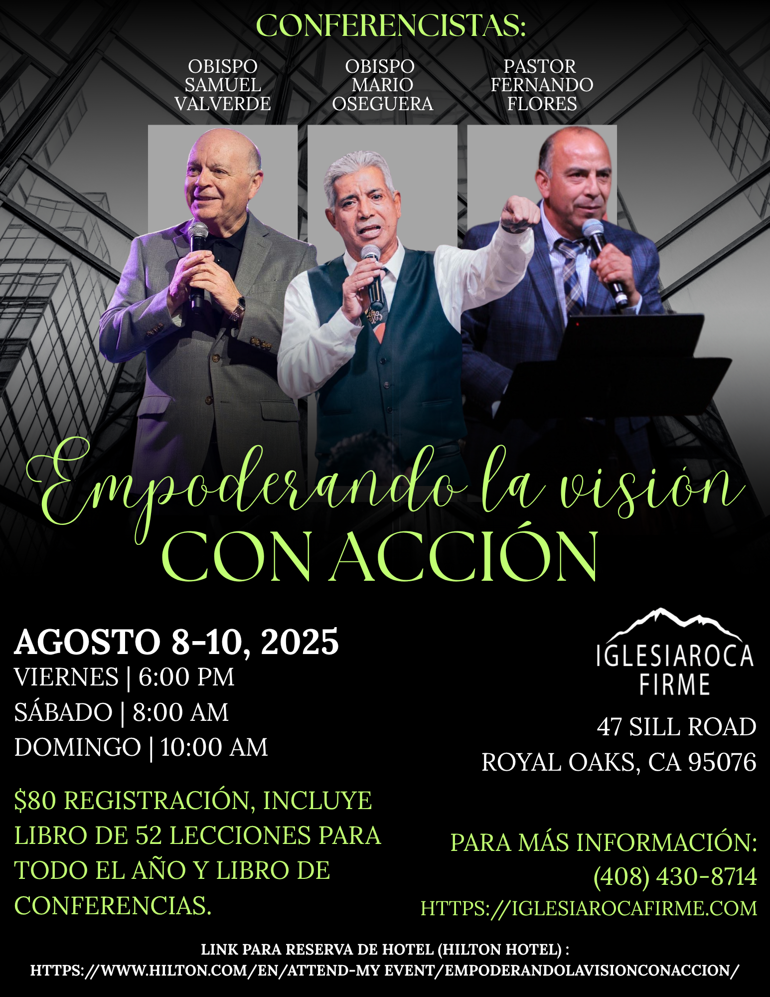 Iglesia Roca Firma 47 Still Road, Watsonvillehttps://iglesiarocafirme.com/event/empoderando-la-vision-con-accion/ ¿Qué es Empoderando la Visión con Acción? Dios bendiga, Empoderando la Visión con Acción es un seminario que tenemos en la iglesia local anualmente, este seminario nos entrena, capacita con herramientas y nos reta a soñar y tomar una visión para trabajar en nuestras iglesias locales desde un ángulo celular. En este […]